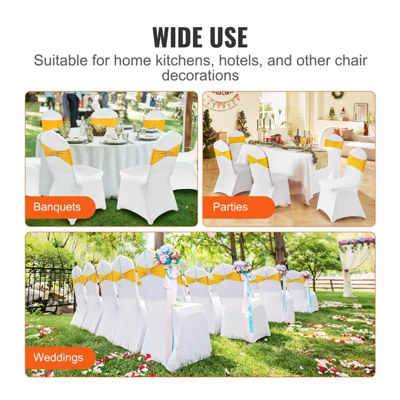 Banquet Chair Cover Set: 50 sets per box, each set includes 1 gold decorative sash and 1 long white chair cover. High-quality removable washable protective slipcovers are made from premium fabric with a simple, elegant design. They not only unify the appearance of your chairs but also transform your old chairs into beautiful wedding reception seats. Ideal for weddings, holidays, banquets, parties, and other celebrations.