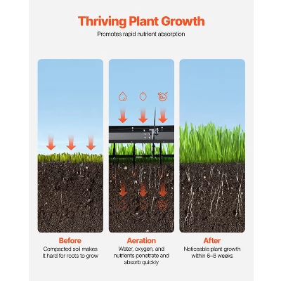 Promotes Plant Growth: This tow behind lawn plug aerator improves soil structure by creating holes that deliver more water and oxygen to plants, avoiding yellowing or decay caused by oxygen and water deficiency. Within 6-8 weeks, you’ll see noticeable growth in your plants.