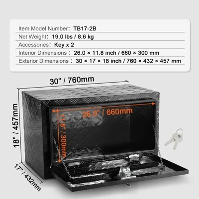 Install In No Time: This underbody truck box measures 30 x 17 x 18 inch/760 x 432 x 457 mm, so make sure to measure your vehicle’s underbody space before purchasing. VEVOR provides a variety of dimensions to meet your needs. You can also purchase brackets to install or do a DIY assembly yourself. Note that if you assemble the truck box on the vehicle, make sure to turn off the power to prevent a short circuit.