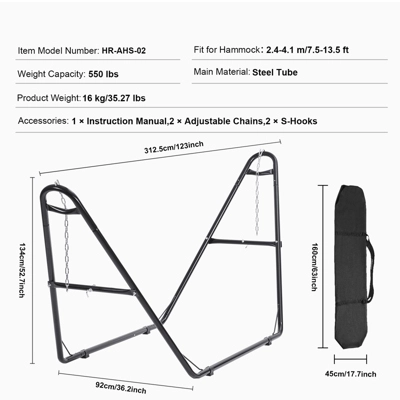 Universal Fit Stand: This hammock stand accommodates various types and sizes of hammocks, suitable for hammocks ranging from 7.5 to 13.5 feet (2.4m-4.1m) in length, providing versatile usage to meet your diverse needs. Overall dimensions: 123” (L) x 36.2” (W) x 52.7” (H).