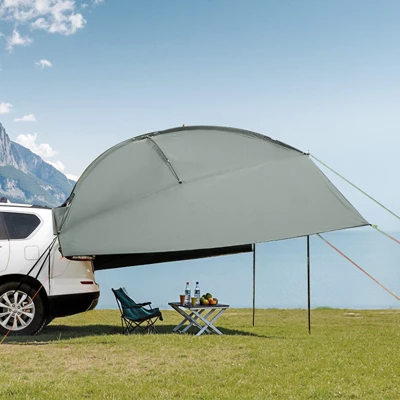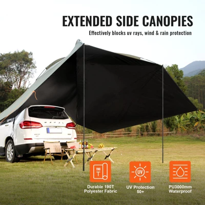 Heavy-Duty & Durable Material: Crafted from premium 190T polyester fabric with a PU 2000mm coating, this vehicle awning is built to last. The Q235 support poles are rust-proof, and the fiberglass rods are corrosion-proof and aging-resistant. Thickeded wind-resistant ropes are ready to withstand all weather conditions.