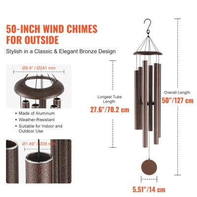 50-Inch Wind Chimes for Outside: Our bronze metal wind chimes feature 6 aluminum tubes, with the longest tube measuring 27.6″ and a diameter of 1.49″. The durable nylon cord and high-density clapper produce a rich, melodious sound. It includes a postcard, a greeting card, and an envelope.