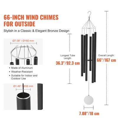 66-Inch Wind Chimes for Outside: Our bronze metal wind chimes feature 6 aluminum tubes, with the longest tube measuring 36.3″ and a diameter of 1.49″. The durable nylon cord and high-density clapper produce a rich, melodious sound. It includes a postcard, a greeting card, and an envelope.