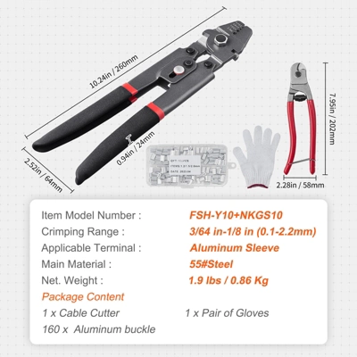 - Includes a cable cutter, gloves, and 160 aluminum sleeves for secure operation.